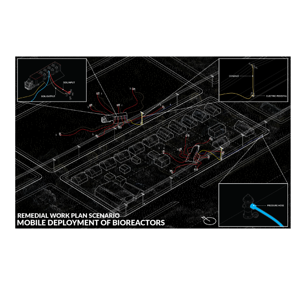 The Tonawanda Industrial Zone and its responsible polluters have, over the course of multiple decades of industrial activity, brought about a full-fledged invasion of the land, water, and air via depositing an excess amount of volatile materials and wastes. Our team engaged in intensive research into the NRG Huntley site, the Tonawanda Coke Brownfield site, and the adjacent superfund sites to better understand the volatile terrestrial conditions these polluters had left behind. Simultaneously, we rigorously studied the political and power systems involved in the remediation of these conditions.